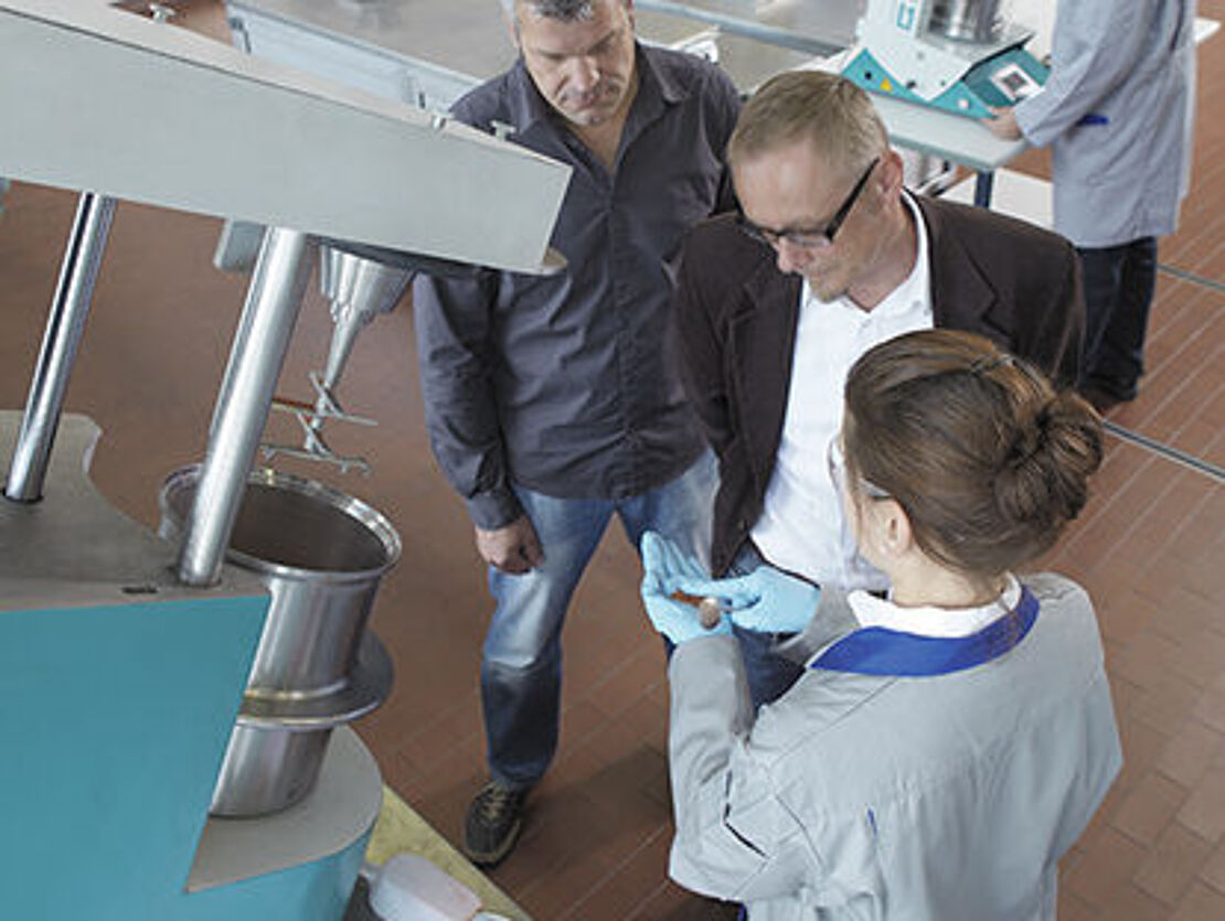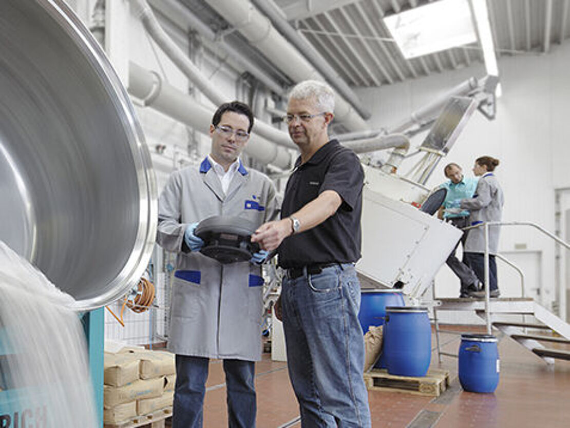 Muchos clientes y usuarios aprovechan la oportundad de realizar ensayos con material original. A escala de laboratorio es posible procesar cantidades de material a partir de 50 g, a escala de producción hasta aprox. 500 kg por carga.